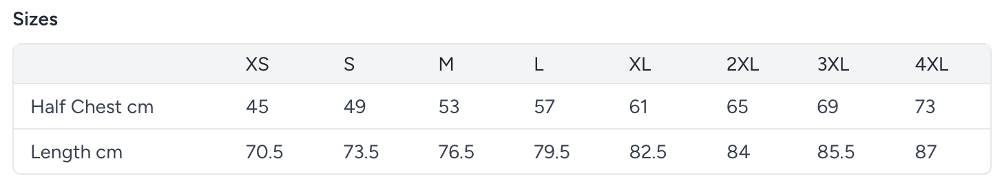 ,XS,S,M,L,XL,2XL,3XL,4XL Half Chest cm,45,49,53,57,61,65,69,73 Length cm,70.5,73.5,76.5,79.5,82.5,84,85.5,87 |